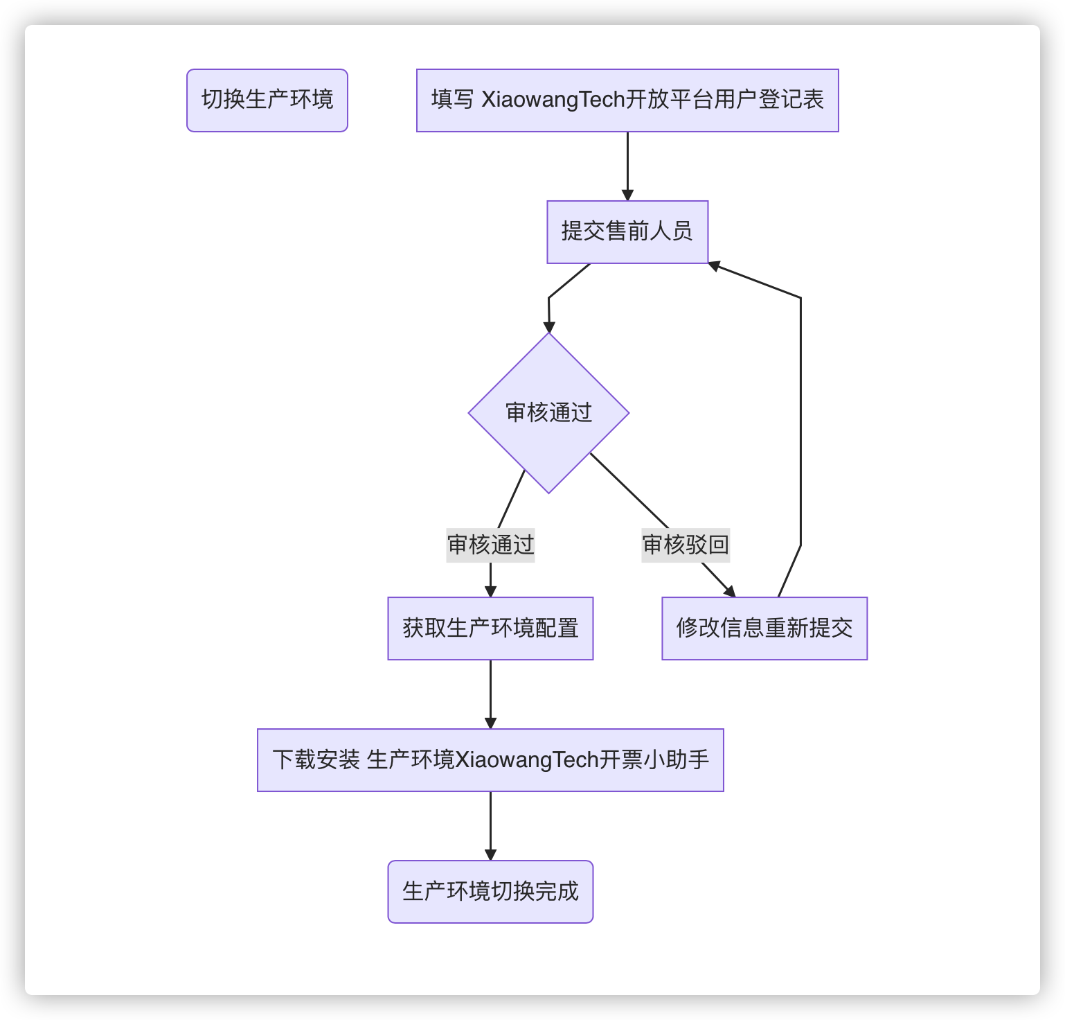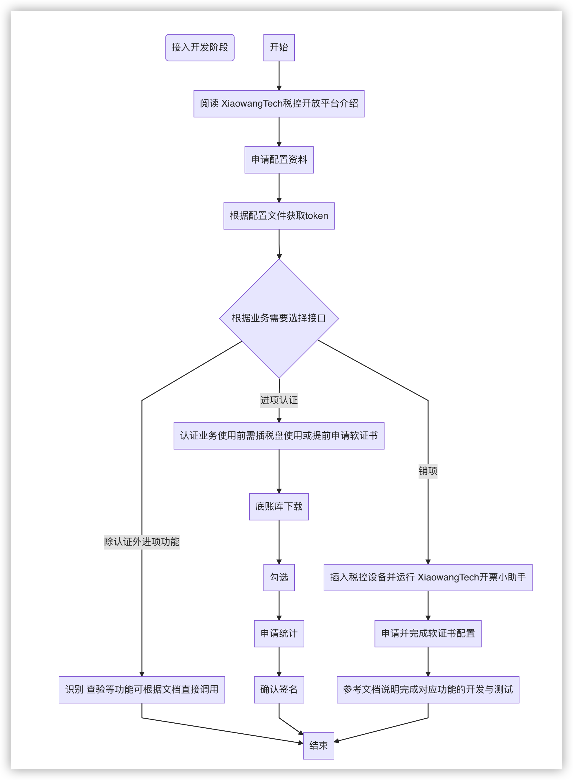 - 完成接入开发与测试后,与XiaowangTech工作人员联系以获取生产环境配置资料(须提供需要使用的税号/设备号/服务器出口IP等资料用于配置)